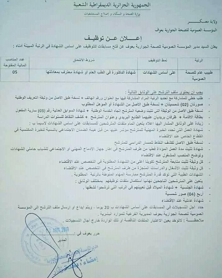 إعلان عن توظيف على أساس الشهادة بالمؤسسة العمومية للصحة الجوارية بتاوقريت بولاية الشلف (الإعلان في صورتين لوضوح أكثر)